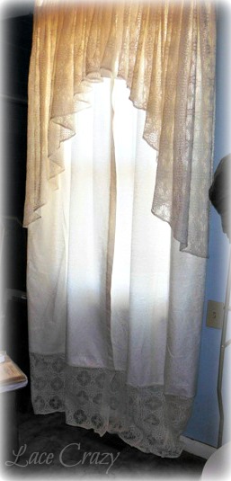 My best friend sent me some crocheted lace valances. I was one short for using them in the kitchen. We had (her & I) devised a plan to maybe whack them up and redo them for the kitchen, but I just knew the bathroom was the place for these...